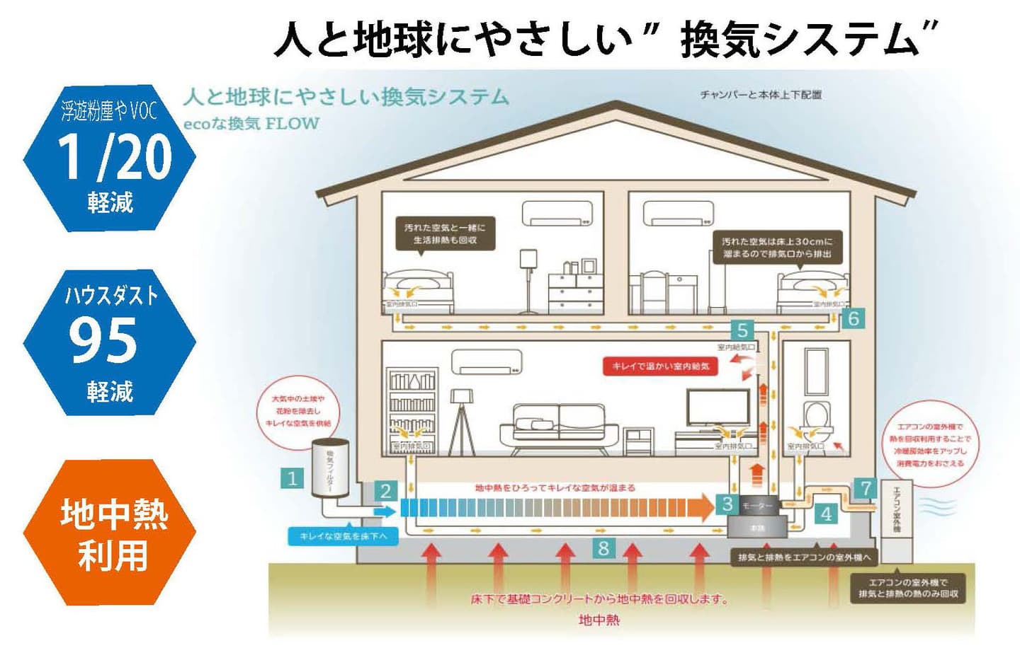 常時換気が義務付けられたことで、暖房熱や冷房熱 は大量に失われていきます。 そこで考え出されたのが排気の熱を吸気へと回収す る熱交換器です。しかし、熱交換器にカビが発生し たり、適切な清掃が行き届かずに不衛生な換気が行 われているという事例が少なくありません。 このシステムは、汚染される可能性の高い熱交換器 は備えず、地中熱の回収と、排気熱をエアコン室外 機によって回収する方法を開発しました。 確実な換気を確保しながら衛生的な熱回収を確保しています 。
