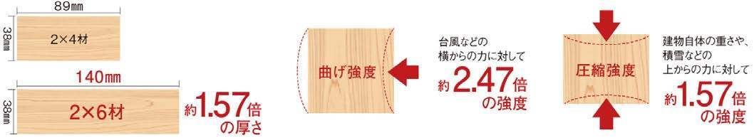 ツーバイフォー材に比べて 約1.57 倍の厚さ。